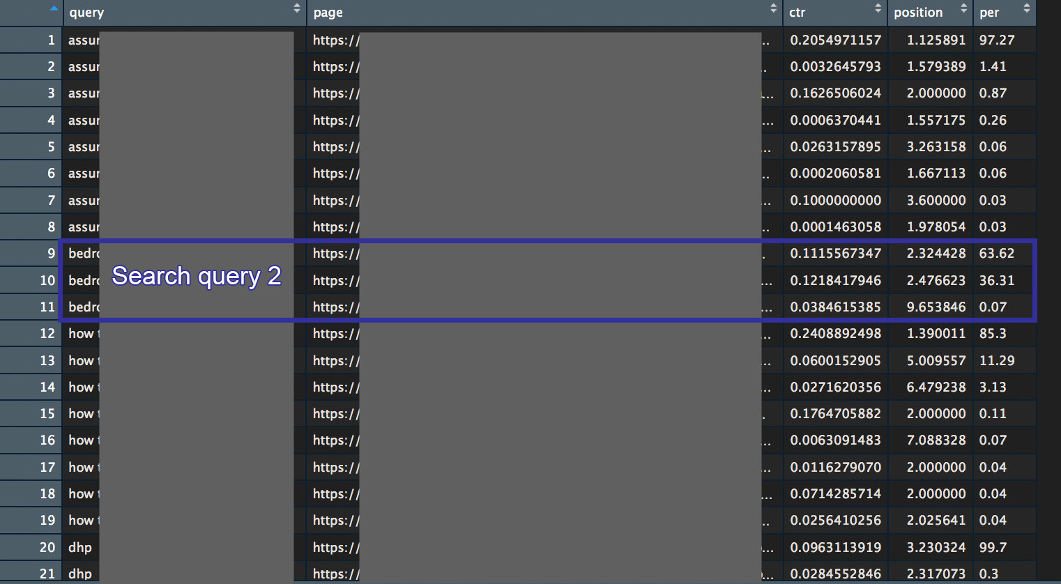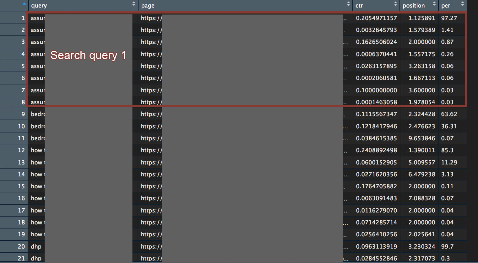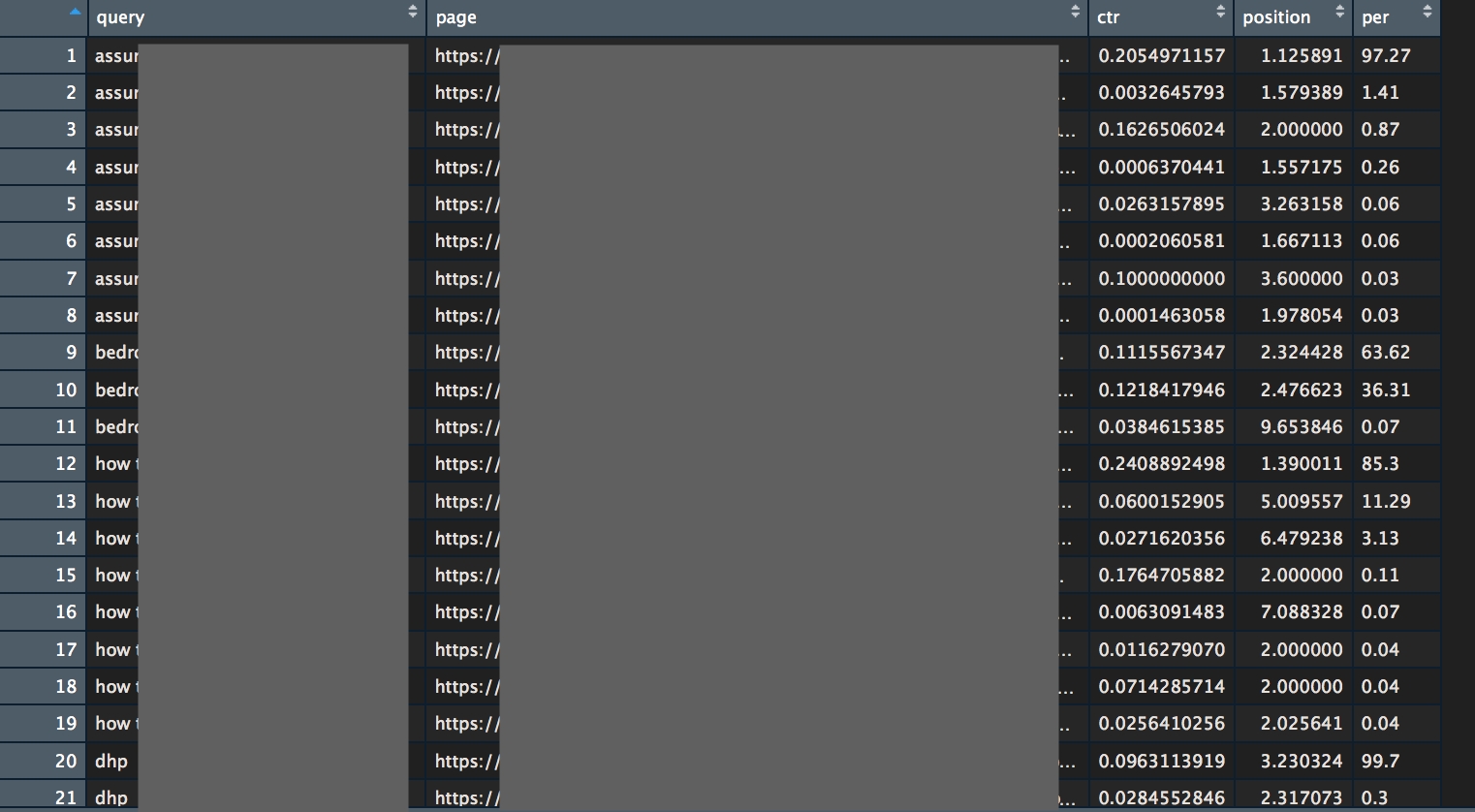 We are requesting ‘query’ and ‘page’ dimensions. If you wish, it’s possible to restrict request to some type of user device, like ‘desktop only’. See function documentation.