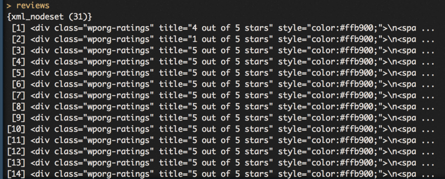 as.numeric()For those who don’t know %>% operator here is simple explanation html_nodes() function will extract from our webpage, HTML tags that match CSS style query selector. In this case, we are looking for a <span> tag whose parent is a <strong> tag. then script will extract the inner text value using html_text() then convert it to a number using as.numeric().